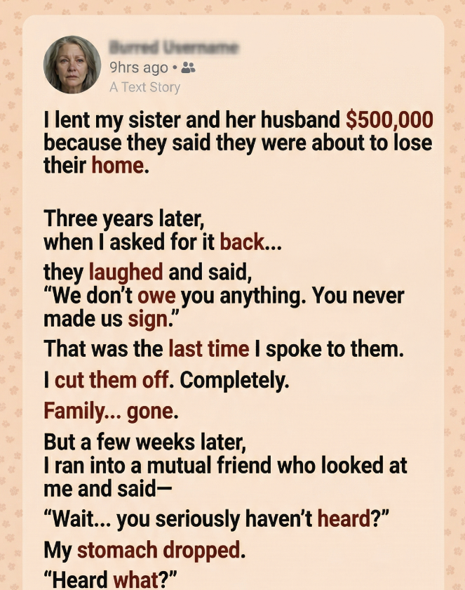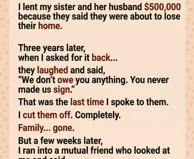 I lent my sister and her husband $500,000 because they said they were about to lose their home. They cried on the phone. Said the bank was taking everything. Said they had nowhere to go. I didn’t hesitate. She was my sister. I wired the money the next morning. No contract, no paperwork, no signatures. Just trust.