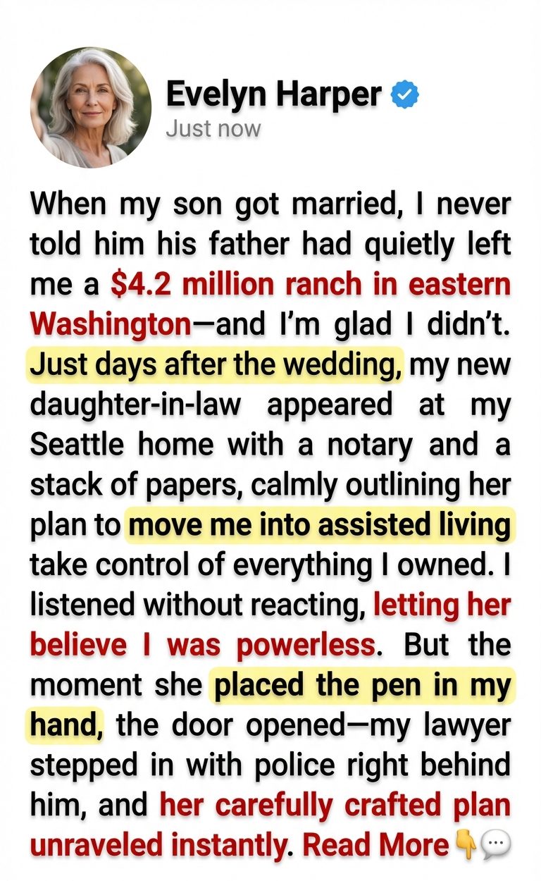 When my son got married, I never told him his father had quietly left me a $4.2 million ranch in eastern Washington—and I’m glad I didn’t. Just days after the wedding, my new daughter-in-law appeared at my Seattle home with a notary and a stack of papers, calmly outlining her plan to move me into assisted living and take control of everything I owned. I listened without reacting, letting her believe I was powerless. But the moment she placed the pen in my hand, the door opened—my lawyer stepped in with police right behind him, and her carefully crafted plan unraveled instantly.