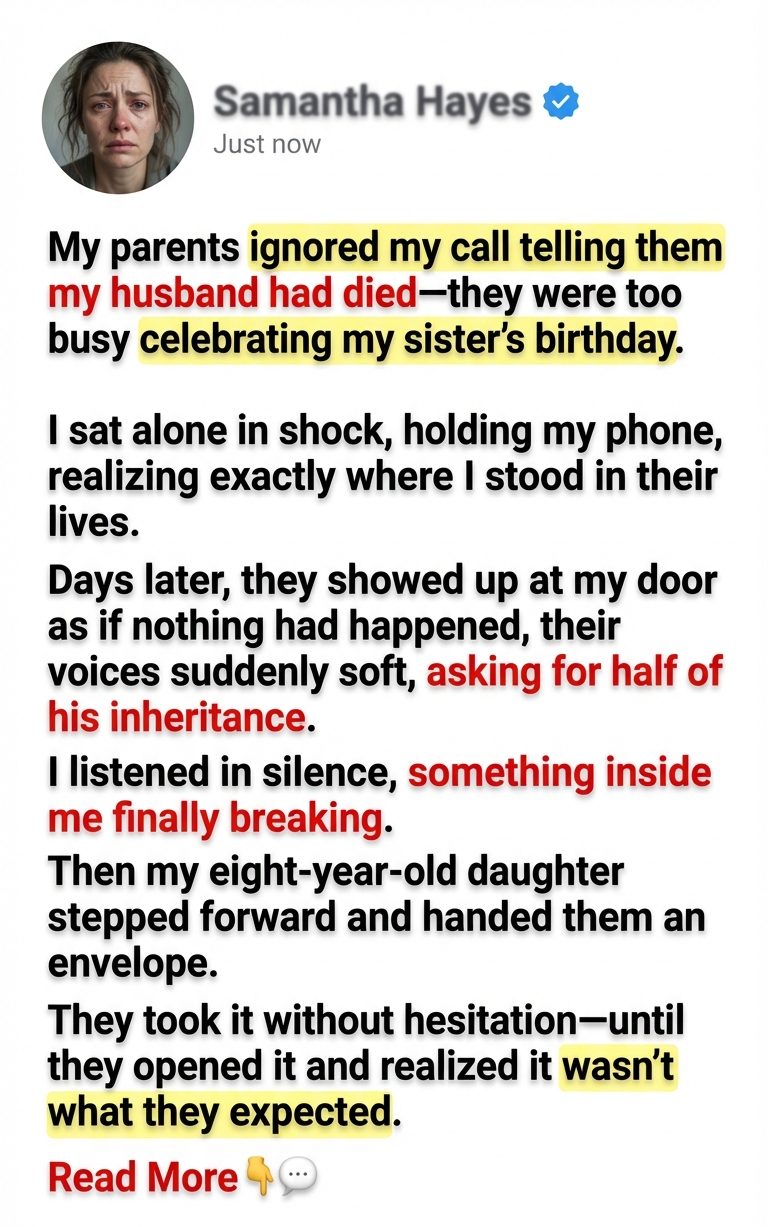 My parents ignored my call telling them my husband had died—they were too busy celebrating my sister’s birthday. I sat alone in shock, holding my phone, realizing exactly where I stood in their lives. Days later, they showed up at my door as if nothing had happened, their voices suddenly soft, asking for half of his inheritance. I listened in silence, something inside me finally breaking. Then my eight-year-old daughter stepped forward and handed them an envelope. They took it without hesitation—until they opened it and realized it wasn’t what they expected.