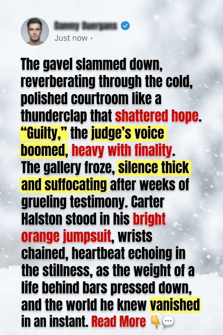 The gavel came down hard, echoing through the cold mahogany courtroom like a final, unyielding door slamming shut forever. “Guilty,” the judge announced, his voice carrying the immense, unforgiving weight of a sentence of life in state custody. No one in the gallery reacted with shock, as the grueling trial had dragged on for weeks toward this end. Carter Halston stood frozen in his bright orange uniform, his wrists bound tightly, listening to his future being erased. He accepted the devastating verdict without a single flinch, completely resigned to a fate he believed he had to endure.